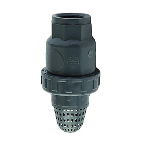 Foot valve made of PVC-U with internal thread and EPDM seals. The valve is designed for installation in suction lines and ensures one-way flow by preventing backflow, thereby protecting the pump and maintaining priming.